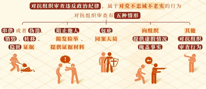 《中國共產(chǎn)黨紀律處分條例》第六十三條規(guī)定了對抗組織審查,應予處分的五種情形:串供或者偽造、銷毀、轉移、隱匿證據(jù);阻止他人揭發(fā)檢舉、提供證據(jù)材料;包庇同案人員;向組織提供虛假情況,掩蓋事實;其他對抗組織審查行為。