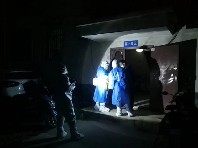 在做好防護(hù)準(zhǔn)備后,扯起嗓門開(kāi)始耐心的給即將入睡的百姓做起動(dòng)員。在疫情期間,經(jīng)歷了漫長(zhǎng)的等待,蝸居在家的市民大多習(xí)慣了早晚無(wú)序的核酸檢測(cè),但還有不少以身體不適、經(jīng)不起“磨煉”等理由進(jìn)行躲避、抗拒,隊(duì)員們不厭其煩,只能冒著風(fēng)險(xiǎn)逐戶登門做思想工作。舉燈踱步、排門逐戶做完檢測(cè)一眨眼三個(gè)多小時(shí)過(guò)去了,再做好試管封裝,數(shù)據(jù)統(tǒng)計(jì)、校對(duì)后已至子夜后半段,深秋微涼的晚風(fēng)已被隊(duì)員的熱情牢牢抵御在防護(hù)服之外。