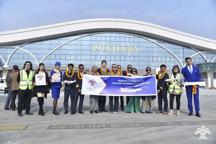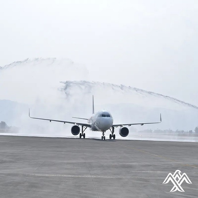 首次亮相在博卡拉國際機(jī)場(chǎng)的喜航客機(jī),穿過象征民航最高禮儀的“水門”,受到隆重歡迎。此架飛機(jī)隨后于15時(shí)44分起飛,于16時(shí)17分返回加德滿都。