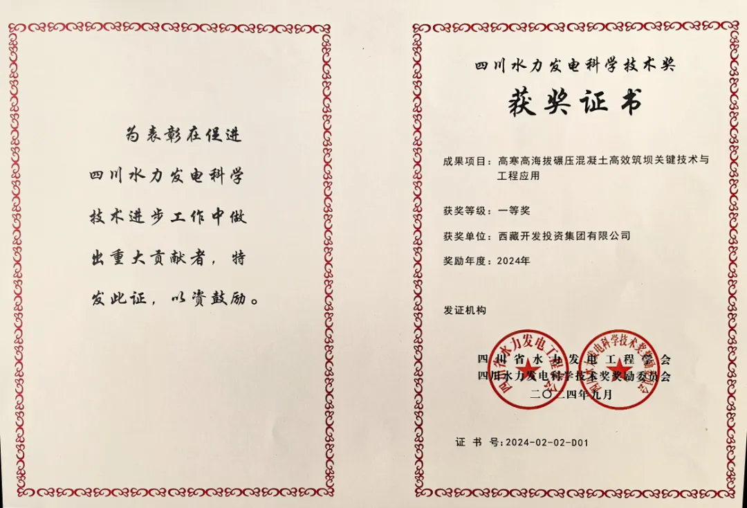 9月25日,四川省水力發(fā)電工程學(xué)會2024年度學(xué)術(shù)年會在成都召開,并舉辦2024年四川水力發(fā)電科學(xué)技術(shù)獎頒獎典禮,西藏開投集團果多水電站創(chuàng)新成果“高寒高海拔碾壓混凝土高效筑壩關(guān)鍵技術(shù)與工程應(yīng)用”榮獲四川水力發(fā)電科學(xué)技術(shù)獎一等獎。