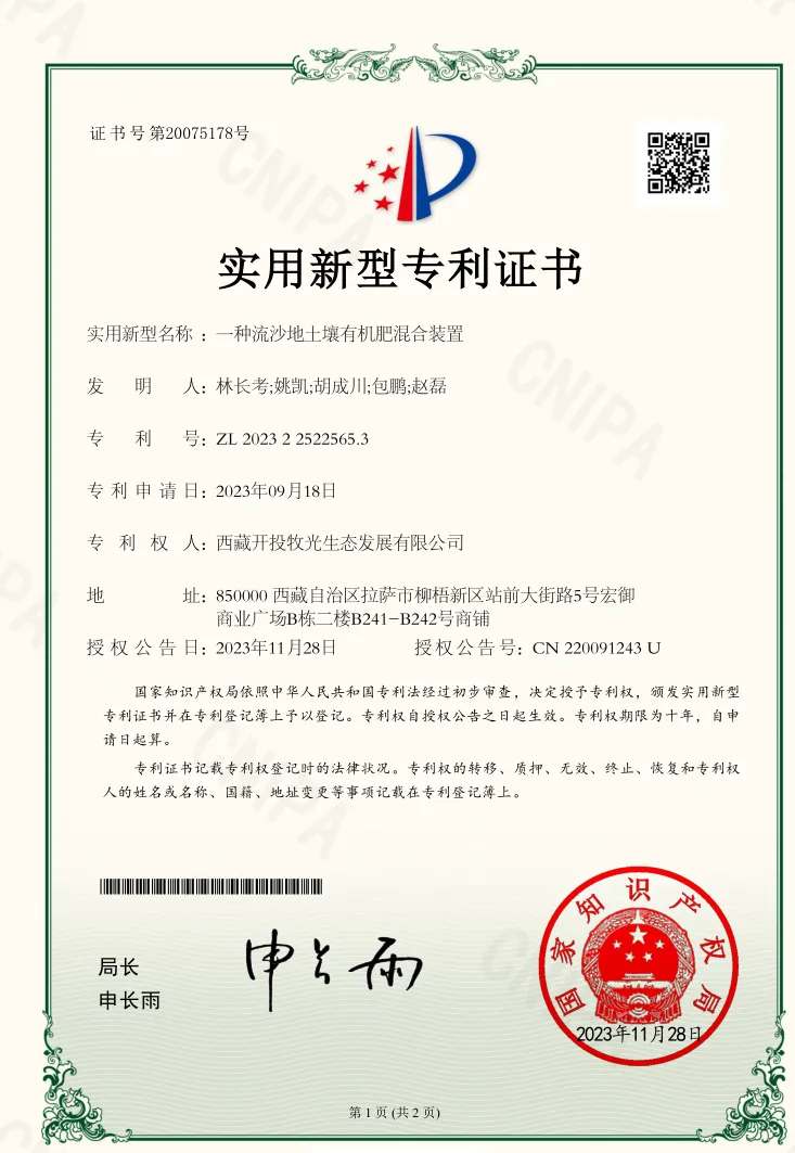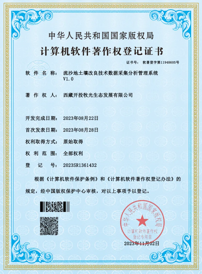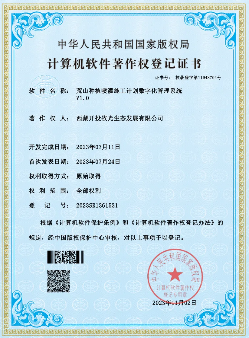 經(jīng)過(guò)一年多的摸索,西藏開(kāi)投在拉薩南北山綠化工程項(xiàng)目形成了豐富的技術(shù)成果,于近日成功申報(bào)獲取了1項(xiàng)實(shí)用新型專利和5項(xiàng)計(jì)算機(jī)軟件著作權(quán)。分別是《一種流沙地土壤有機(jī)肥混合裝置》實(shí)用新型專利和《土壤改良種植技術(shù)項(xiàng)目實(shí)施進(jìn)度跟蹤管理系統(tǒng)V1.0》《流沙地土壤改良技術(shù)數(shù)據(jù)采集分析管理系統(tǒng)V1.0》《流沙地土壤改良農(nóng)業(yè)資源調(diào)度管理軟件V1.0》《荒山種植噴灌施工計(jì)劃數(shù)字化管理系統(tǒng)V1.0》《荒山種植噴灌施工智能化控制管理軟件V1.0》計(jì)算機(jī)軟件著作權(quán)。