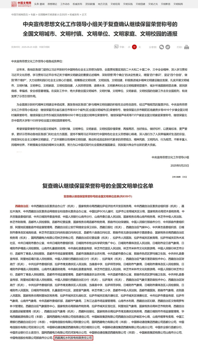 延續(xù)17年!滿拉水電公司再獲“全國(guó)文明單位”榮譽(yù)稱號(hào)
