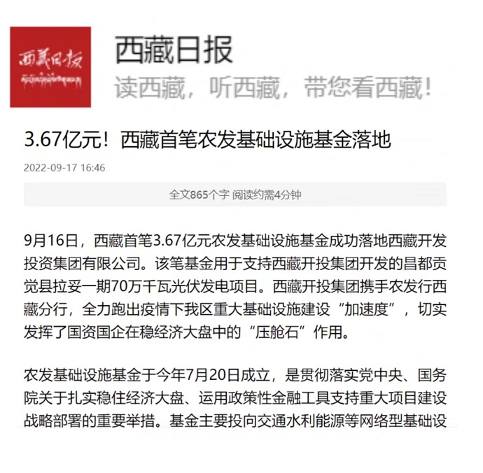 ?。ň幷甙矗段鞑厝?qǐng)?bào)》2022年9月17日?qǐng)?bào)道西藏首筆農(nóng)發(fā)基礎(chǔ)設(shè)施基金落地西藏開投集團(tuán)。全文如下: