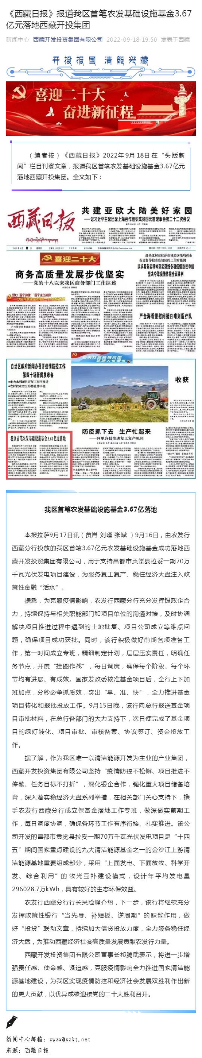 《西藏日報》報道我區(qū)首筆農發(fā)基礎設施基金3.67億元落地西藏開投集團