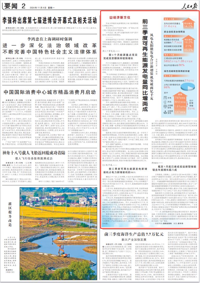 今年以來,我國能源綠色低碳轉型不斷取得新突破。前三季度,全國可再生能源發(fā)電新增裝機2.1億千瓦,同比增長21%,占電力新增裝機的86%。其中,水電新增797萬千瓦,風電新增3912萬千瓦,太陽能發(fā)電新增1.61億千瓦,生物質(zhì)發(fā)電新增137萬千瓦,風電太陽能發(fā)電合計新增突破2億千瓦。截至9月底,全國可再生能源裝機達到17.3億千瓦,同比增長25%,約占我國總裝機的54.7%。