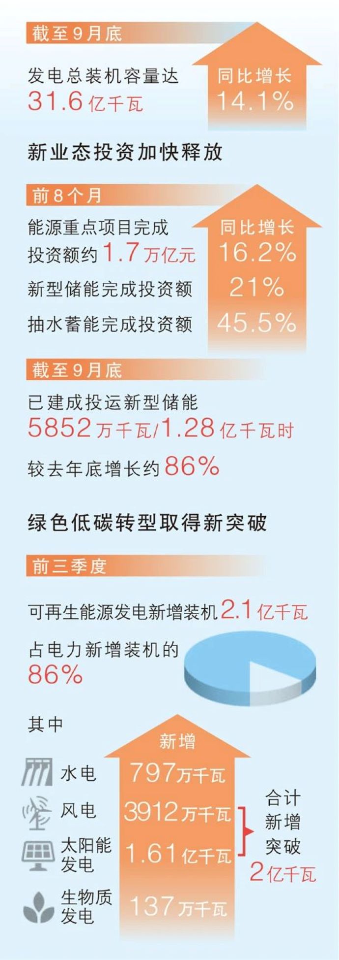 能源新業(yè)態(tài)投資多點開花。前8個月,新型儲能完成投資額同比增長21%,抽水蓄能完成投資額同比增長45.5%。甘肅、青海、新疆一批多能互補清潔能源基地項目有序推進,內(nèi)蒙古在建綠氫制備項目、河南在建加氫設施項目持續(xù)形成有效投資。