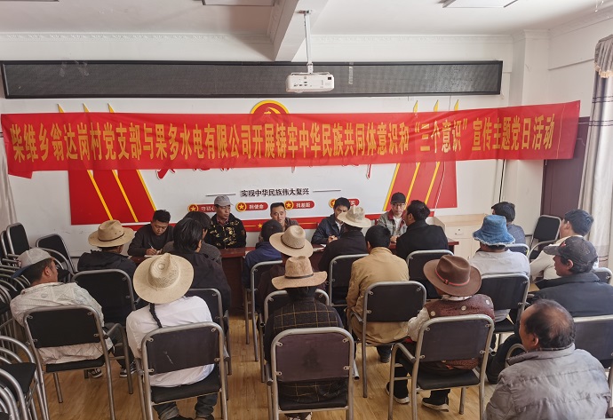6月25日,果多水電公司黨支部結(jié)合習近平新時代中國特色社會主義思想主題教育活動與柴維鄉(xiāng)翁達崗村黨支部聯(lián)合開展了以“鑄牢中華民族共同體意識和‘三個意識’”為主題的黨日活動。