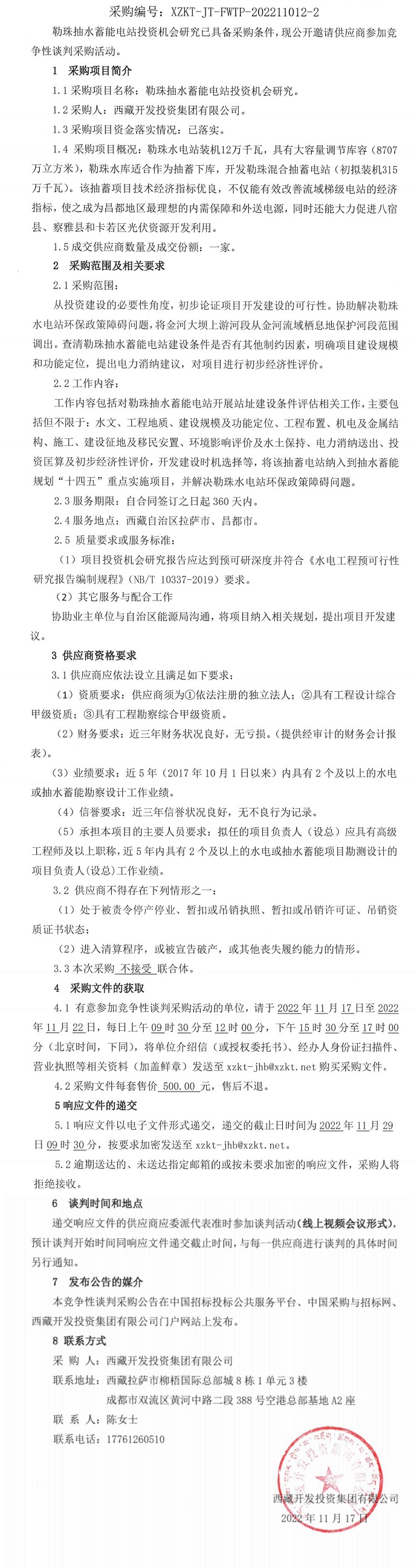 勒珠抽水蓄能電站投資機會研究競爭性談判采購二次公告