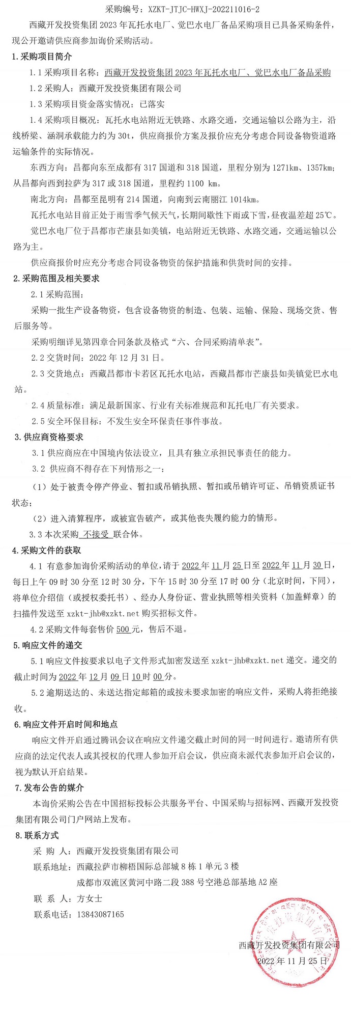 西藏開發(fā)投資集團2023年瓦托水電廠、覺巴水電廠備品