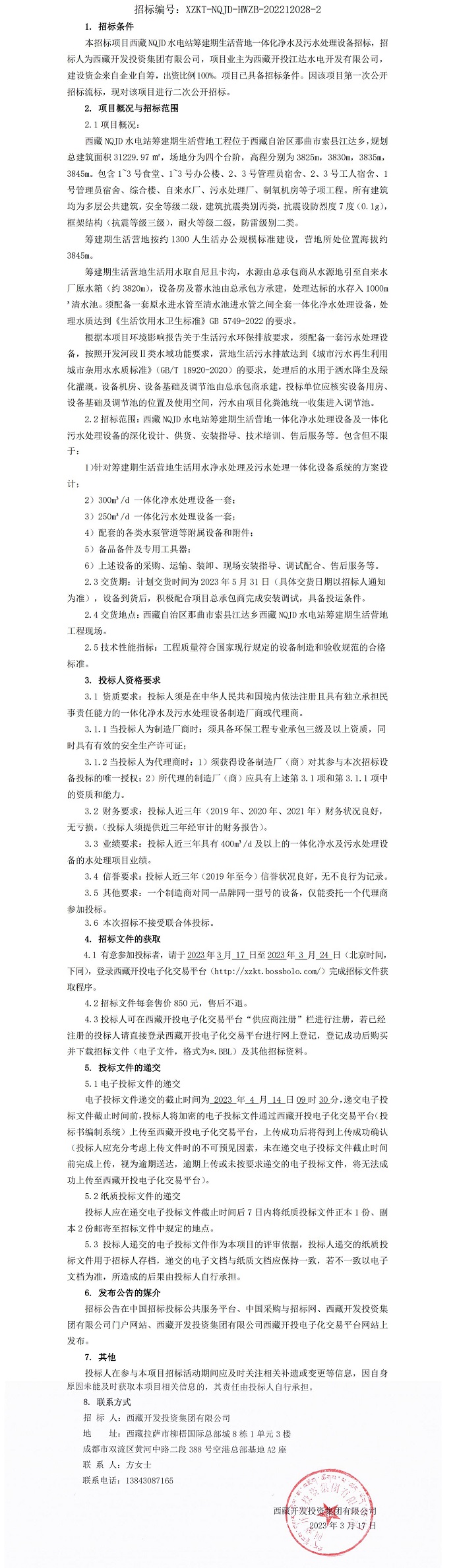 西藏 NQJD 水電站籌建期生活營地一體化凈水及污水處理設(shè)備招標(biāo)公告