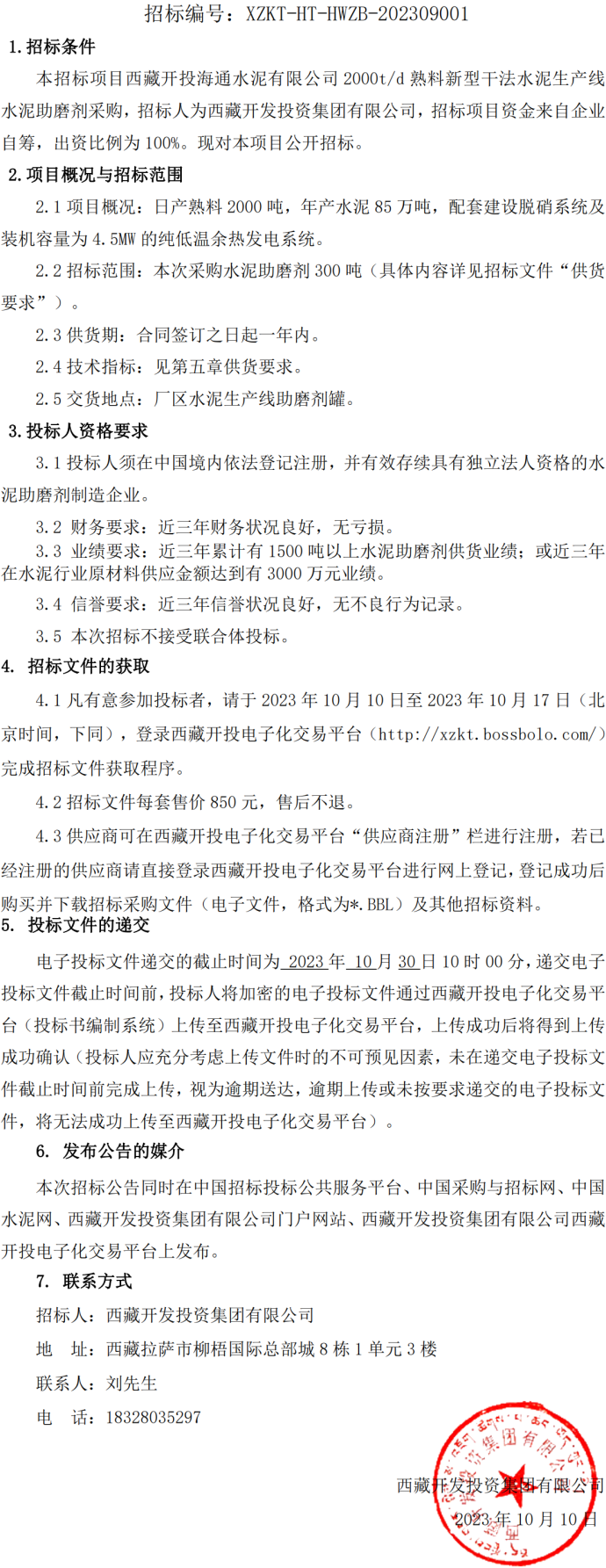 西藏開投海通水泥有限公司 2000t/d 熟料新型干法水泥生產(chǎn)線水泥助磨劑采購招標公告