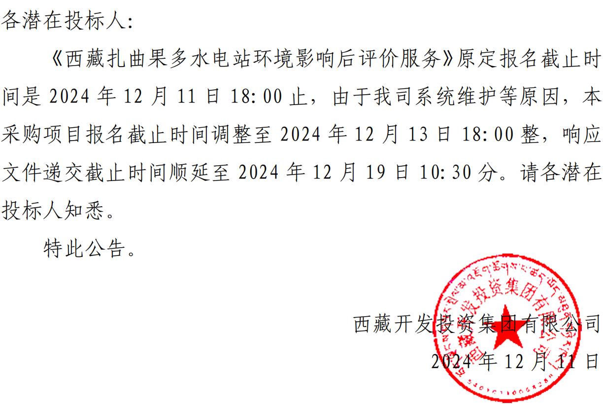 關于延長《西藏扎曲果多水電站環(huán)境影響后評價服務》詢價報名截止時間的公告