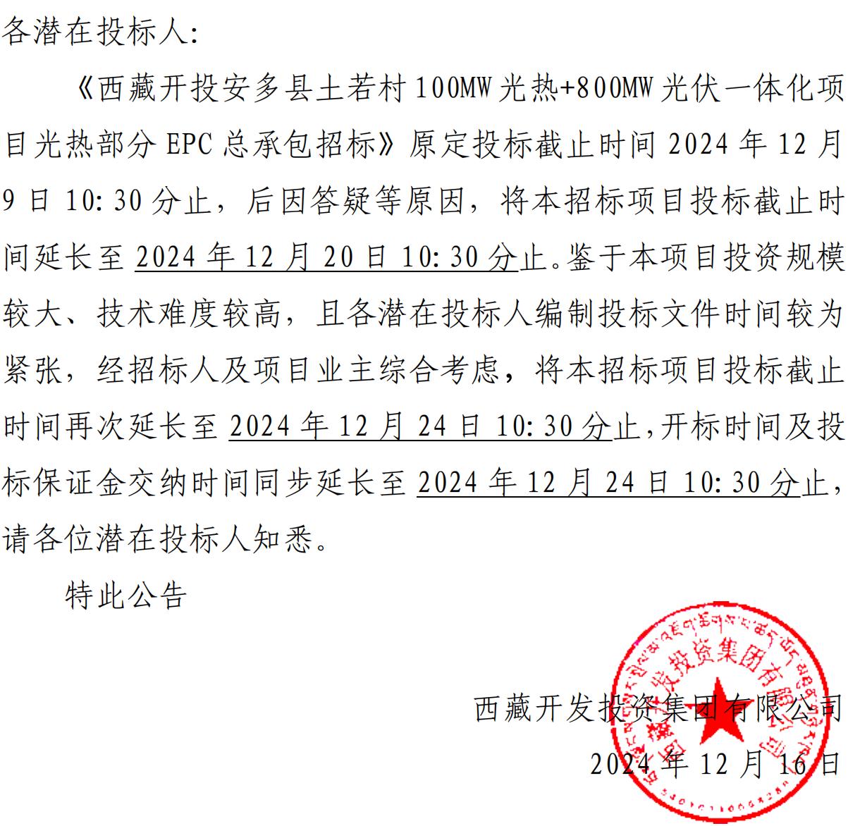 關(guān)于再次延長《西藏開投安多縣土碩 100MW光熱+800MW 光伏一體化項(xiàng)目光熱部分 EPC總承包招標(biāo)》投標(biāo)截止時(shí)間的公告